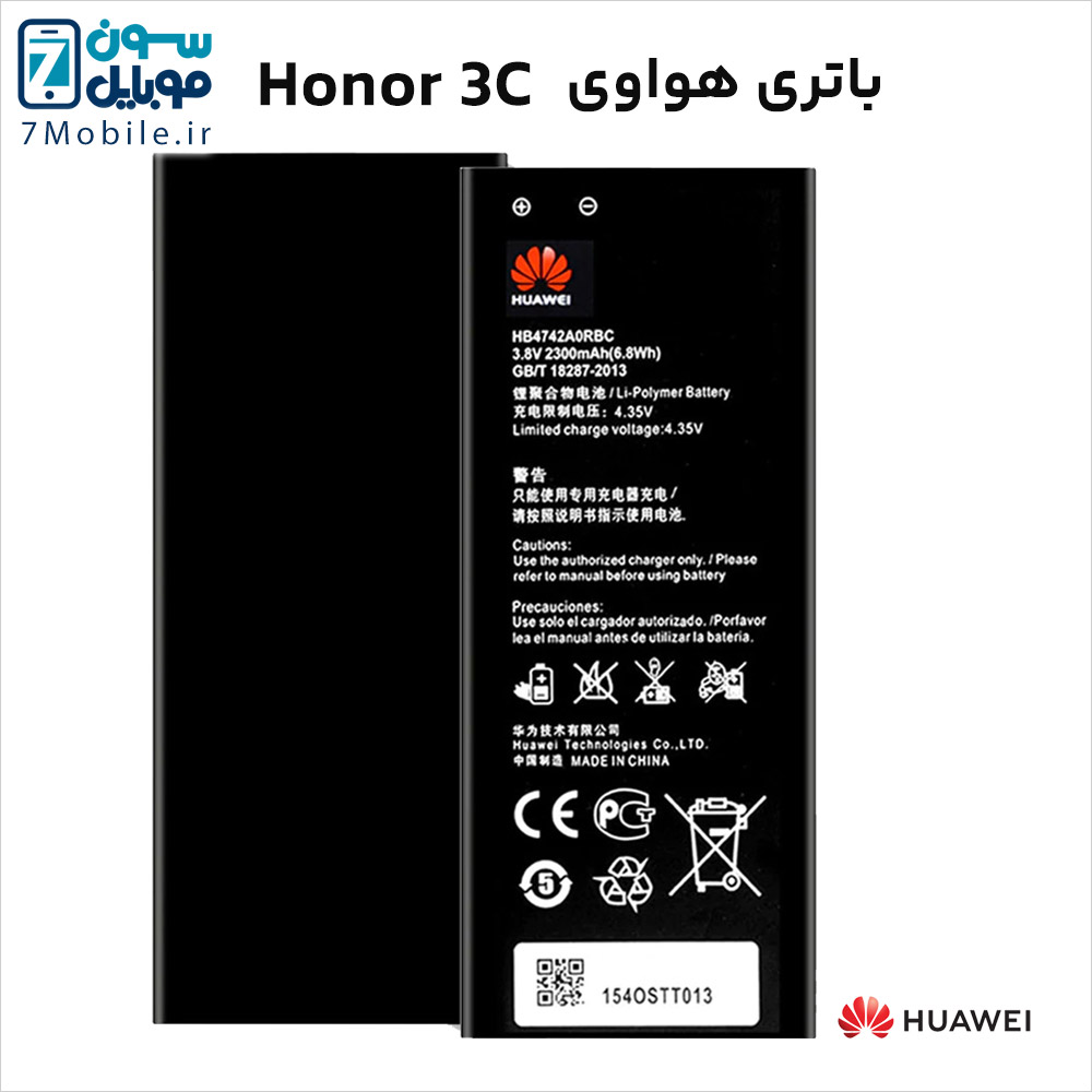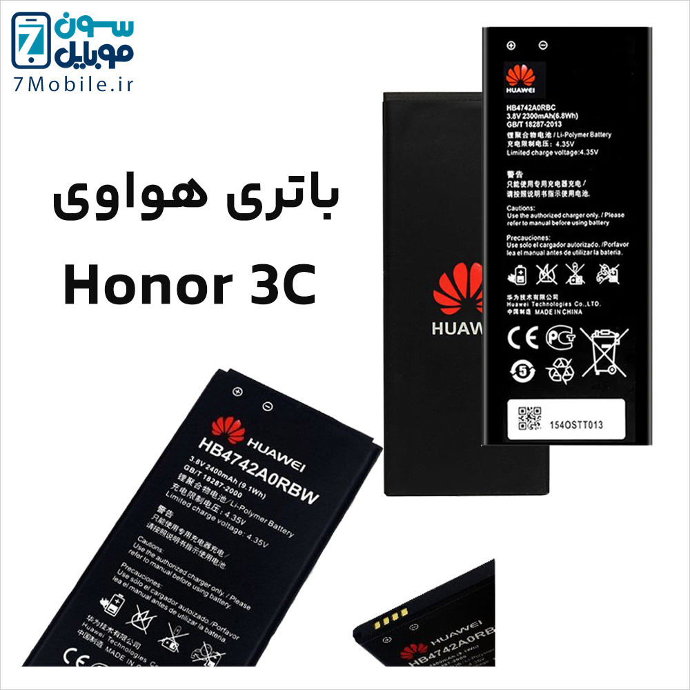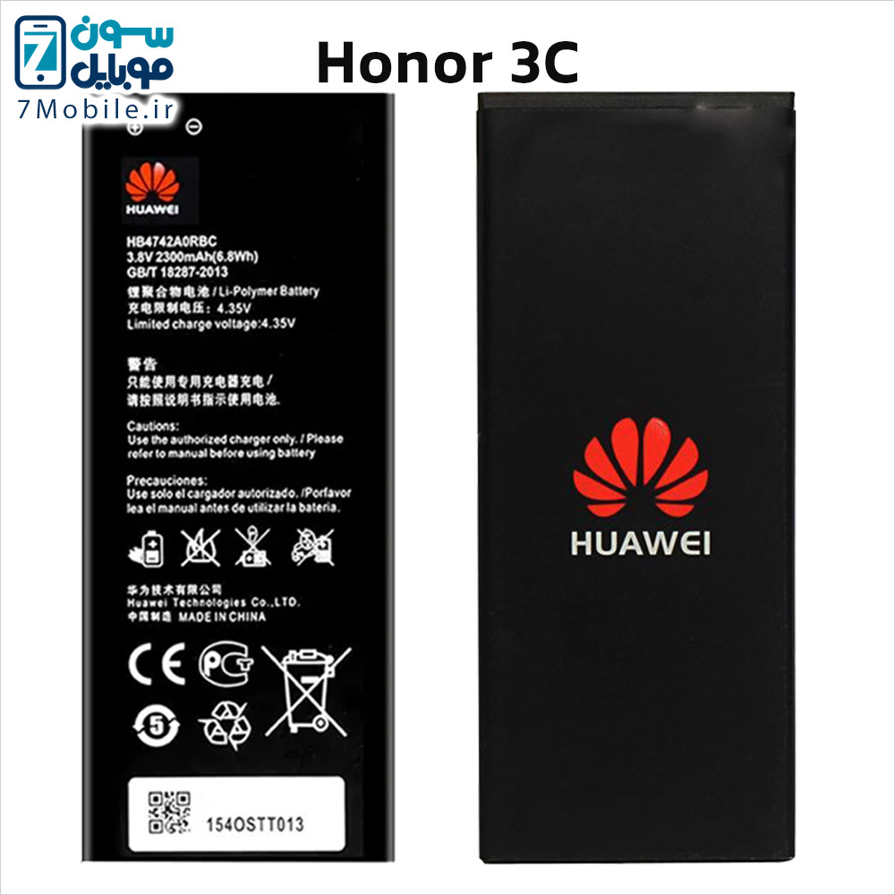 باطری اصلی هواوی Huawei Honor 3C با 6 ماه گارانتی تعویض و باد‌‌کردگی که مدل آن HB4742A0RBW و HB4742A0RBC است و ظرفیت 2300 میلی آمپری دارد و از نوع لیتیوم پلیمر (Li-Po) با ولتاژ 3.8 ولت می‌باشد.