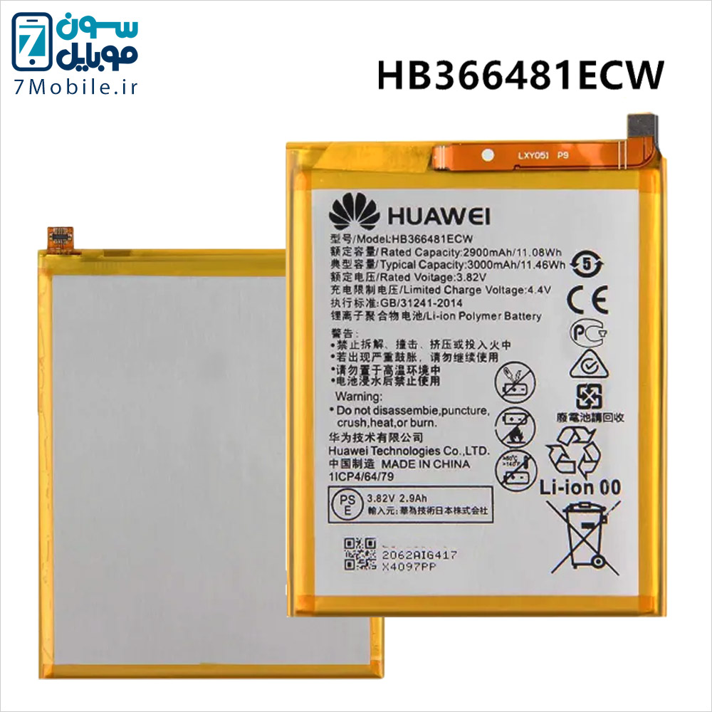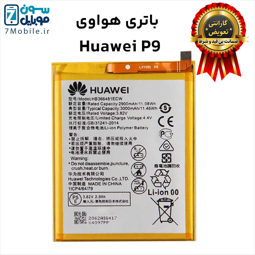 باتری اصلی هواوی Huawei P9 با ۶ ماه گارانتی تعویض و باد‌‌کردگی و با کد باتری HB366481ECW که ظرفیت 3000 میلی آمپری دارد و از نوع لیتیوم پولیمری (Li-po) با ولتاژ 3.8 می‌باشد. توجه داشته باشید این مدل باتری هواوی جز باتری های داخلی و جدانشدنی است که توسط کاربر قابل تعویض نمی باشد و برای تعویض آن باید به مراکز معتبر مراجعه کنید.