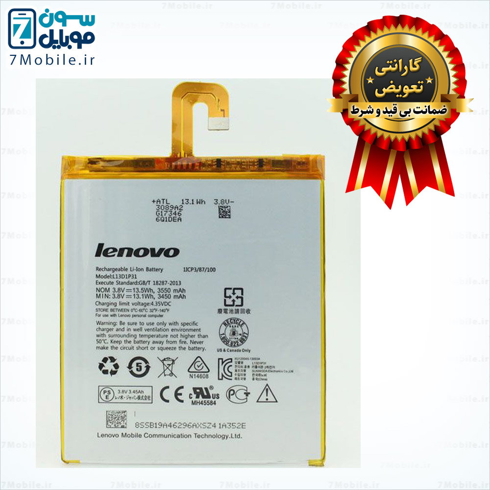 باتری اصلی تبلت لنوو Lenovo A3500 (3G) با 6 ماه گارانتی که مدل آن L13D1P31 می باشد. این باطری با ظرفیت 3450 میلی آمپری از نوع Li-ion با ولتاژ 3.7 ولت می باشد که دارای گارانتی تعویض نیز است.