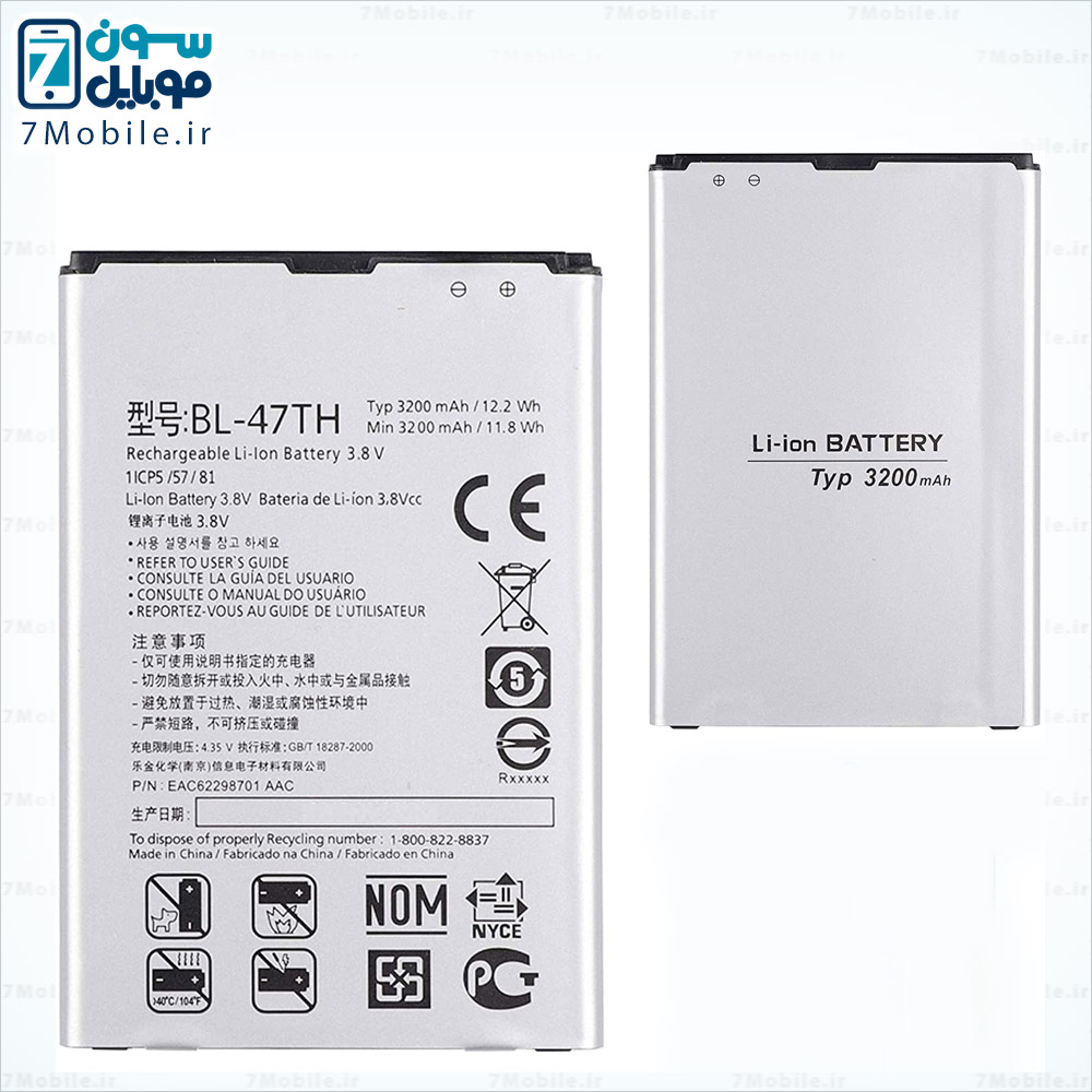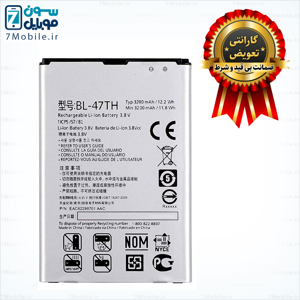 باتری اصلی LG G Pro 2 –BL-47TH با 6 ماه گارانتی و دارای باتری جداشدنی با ظرفیت 3200 میلی آمپر از نوع لیتیوم یونی با ولتاژ 3.8 ولت می باشد.