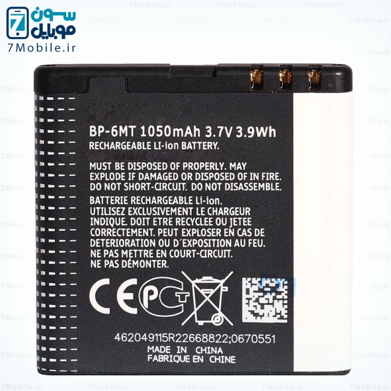 باطری اصلی نوکیا مدل BP-6MT ، این باطری با ظرفیت 1050 میلی آمپری از نوع Li-ion با ولتاژ 3.7 ولت می باشد که دارای گارانتی تعویض نیز است. این باطری با ظرفیت 1050 میلی آمپری از نوع Li-ion با ولتاژ 3.7 ولت می باشد که دارای گارانتی تعویض نیز است. این باطری با گوشی های 6720c , E5 , E51 , N81 , N81(8G) , N82 سازگار می باشد.