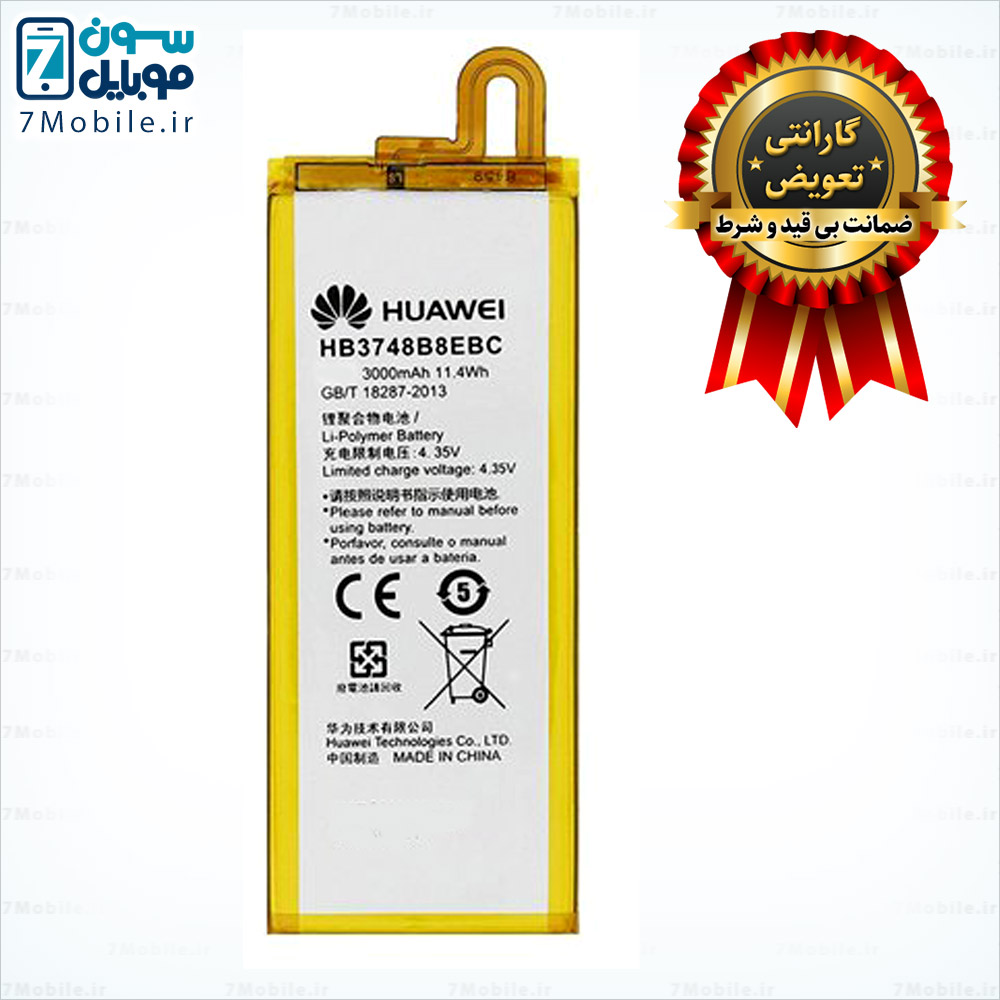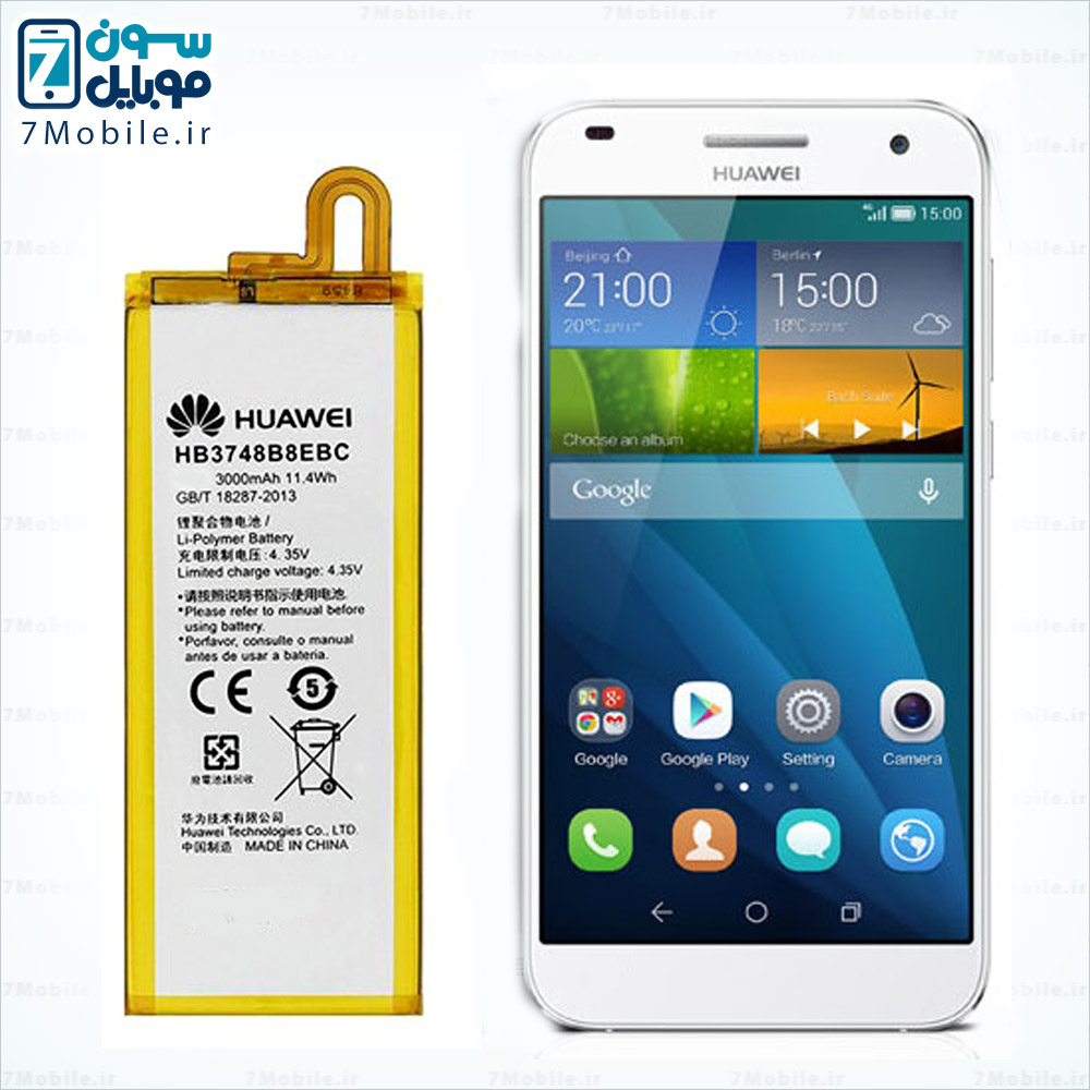 باتری اصلی گوشی HUAWEI Ascend G7 که مدل آن HB3748B8EBC می باشد. این باتری با ظرفیت 3000 میلی آمپری از نوع لیتیوم پلیمر با ولتاژ 3.8 ولت می باشد که دارای گارانتی تعویض نیز است.