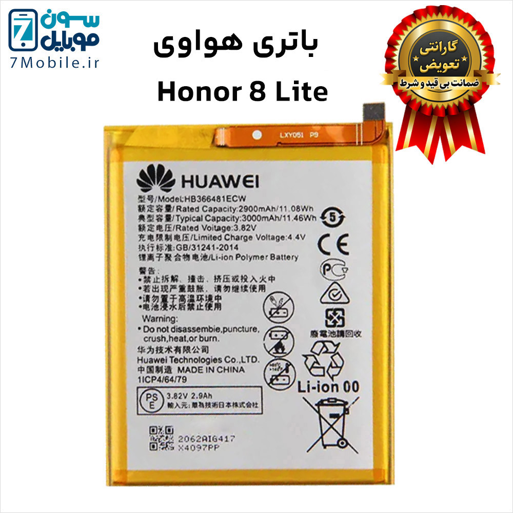باتری اصلی هواوی Huawei Honor 8 Lite با ۶ ماه گارانتی تعویض و باد‌‌کردگی و با کد باتری HB366481ECW که ظرفیت 3000 میلی آمپری دارد و از نوع لیتیوم پولیمری (Li-po) با ولتاژ 3.8 می‌باشد. توجه داشته باشید این مدل باتری هواوی جز باتری های داخلی و جدانشدنی است که توسط کاربر قابل تعویض نمی باشد و برای تعویض آن باید به مراکز معتبر مراجعه کنید.