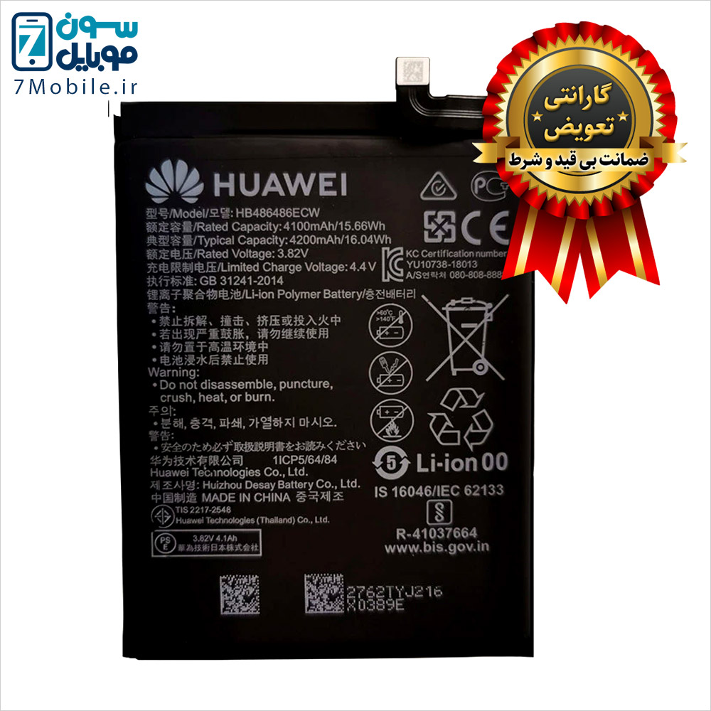 باتری اصلی هواوی Huawei Nova 7i که با کد باتری HB486486ECW و ظرفیت 4200 میلی آمپری و از نوع لیتیوم پلیمری داخلی با ولتاژ 3.8 ولت می باشد. این مدل باتری هواوی دارای گارانتی تعویض و بادکردگی به مدت 6 ماه است. توجه داشته باشید این مدل باتری هواوی جز باتری های داخلی و جدانشدنی است که توسط کاربر قابل تعویض نمی باشد و برای تعویض آن باید به مراکز معتبر مراجعه کنید. این مدل گوشی هواوی قابلیت فست شارژ دارد.