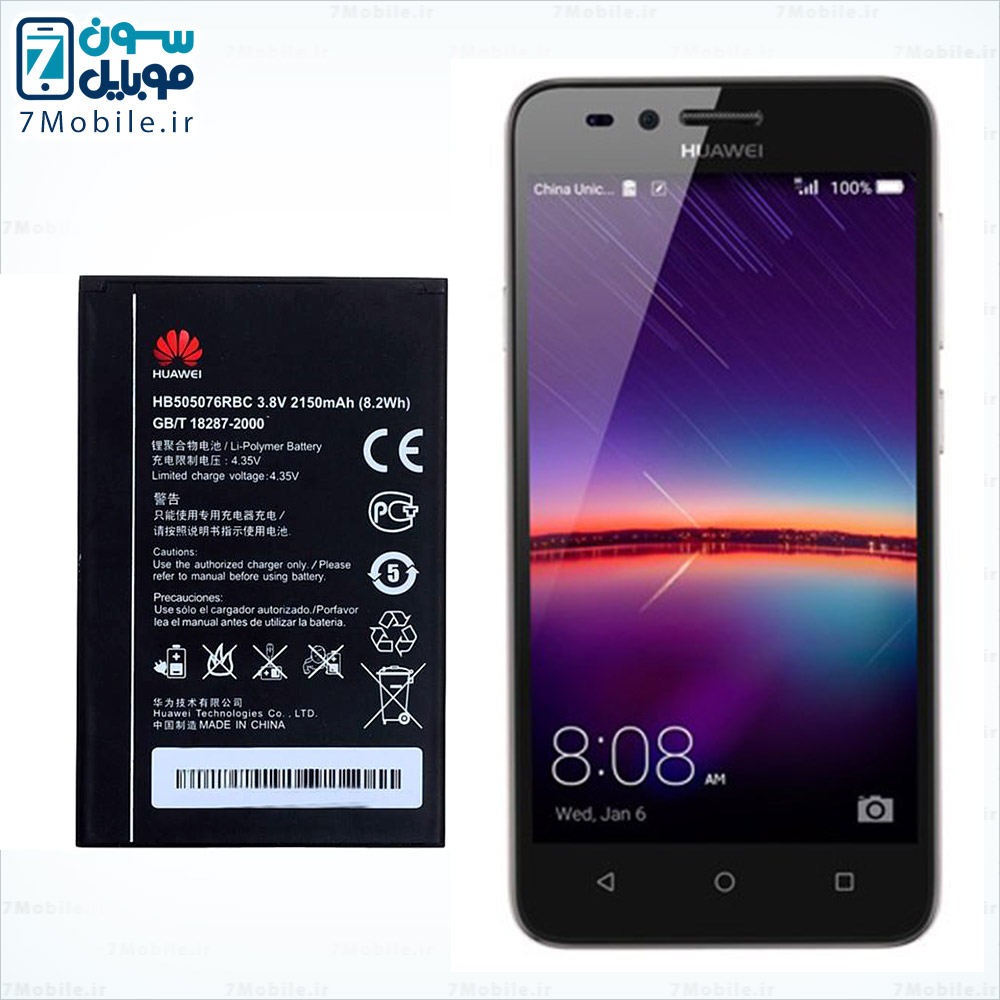 باتری اصلی گوشی Huawei Y3II که مدل آن HB505076RBC می باشد. این باتری با ظرفیت 2150 میلی آمپری از نوع Li-ion با ولتاژ 3.7 ولت می باشد که دارای گارانتی تعویض نیز است.
