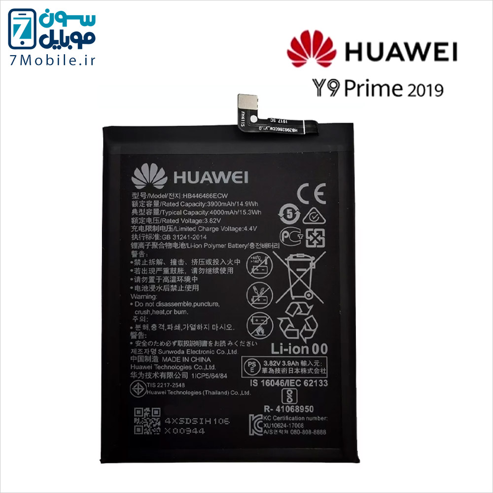 باتری اصلی هواوی HUAWEI Y9 Prime 2019 با کد HB446486ECW و HB436486ECW که ظرفیت 4000 میلی آمپری دارد و از نوع لیتیوم یون داخلی با ولتاژ 3.8 ولت می‌باشد. این مدل از باتری هواوی دارای گارانتی تعویض و بادکردگی به مدت 6 ماه است. توجه داشته باشید این مدل باتری هواوی جز باتری‌های داخلی و جدانشدنی است که توسط کاربر قابل تعویض نمی‌باشد و برای تعویض آن باید به مراکز معتبر مراجعه کنید.