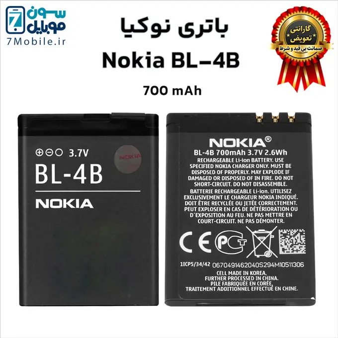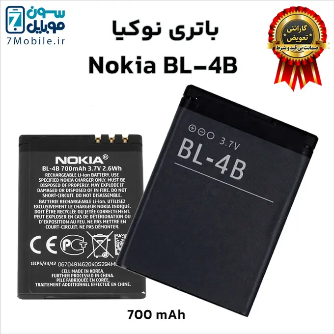 باتری اصلی نوکیا Nokia BL-4B با 6 ماه گارانتی تعویض بی قید و شرط حتی بادکردگی که ظرفیت ۷۰۰ میلی‌آمپری دارد و از نوع لیتیوم یون با ولتاژ ۳.۷ ولت می‌باشد. این مدل باتری نوکیا مناسب گوشی‌های نوکیا مدل‌های nokia 2505 / 2630 / 2660 / 2760 / 6078 / 6111 / 7088 / 7370 / 7373 / 7500Prism / N76 است.