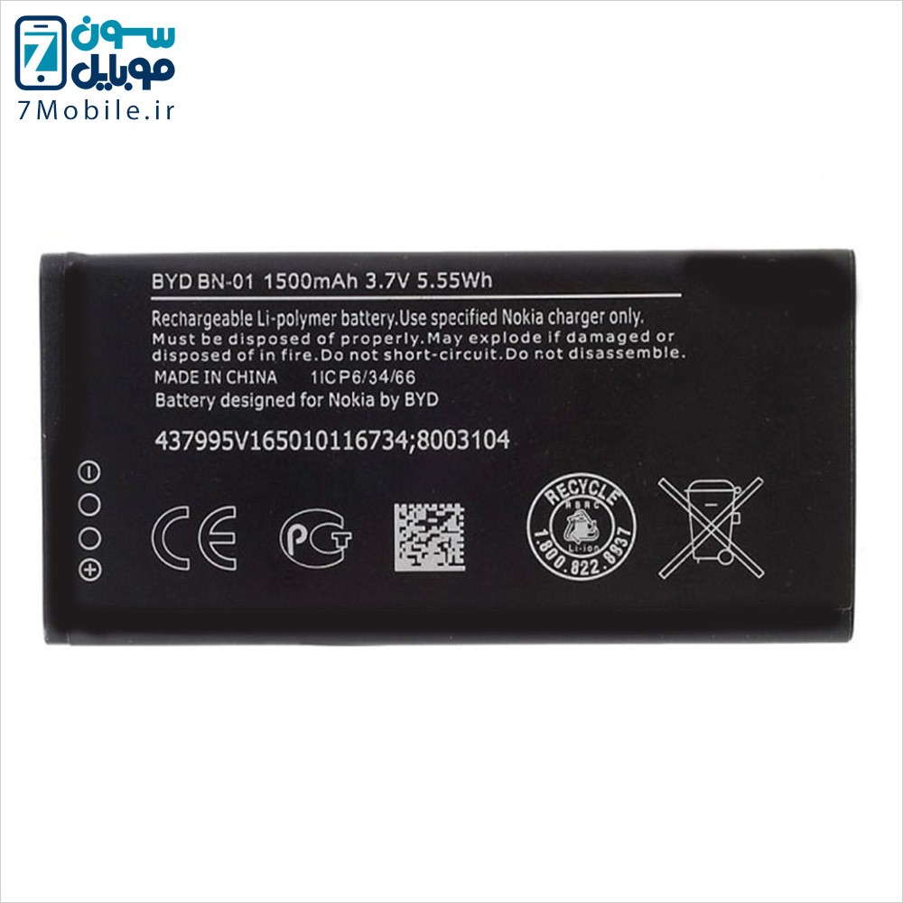 باتری اصلی نوکیا باتری اصلی نوکیا Nokia X که مدل آن BN-01 است و ظرفیت 1500 میلی آمپری دارد و از نوع لیتیوم یون با ولتاژ 3.7 ولت می باشد. این باتری دارای 3 ماه گارانتی تعویض است.
