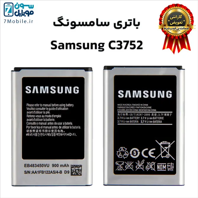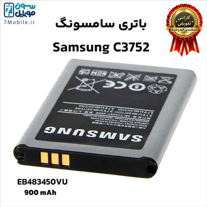 باتری اصلی سامسونگ SAMSUNG C3752 با کد فنی باتری EB483450VU و ۶ ماه گارانتی تعویض بی‌قید و شرط حتی بادکردگی که ظرفیت ۹۰۰ میلی‌آمپری دارد و از نوع لیتیوم یون با ولتاژ ۳.۷ ولت می‌باشد.