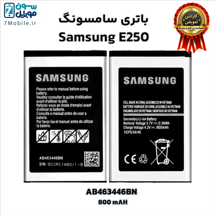 باتری اصلی سامسونگ Samsung E250 با 6 ماه گارانتی تعویض بی قید و شرط حتی بادکردگی و کد فنی باتری AB463446BU یا AB463446BN که ظرفیت ۸۰۰ میلی‌آمپری دارد و از نوع لیتیوم یون با ولتاژ ۳.۷ ولت می‌باشد.
