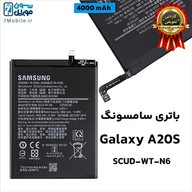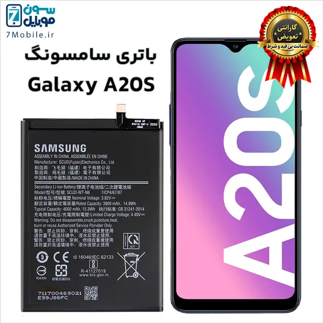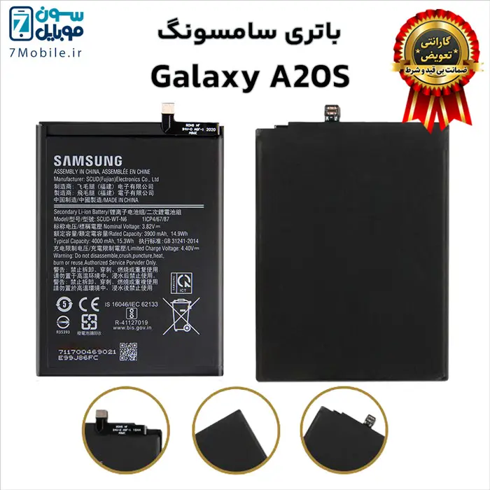 باتری اصلی سامسونگ Samsung Galaxy A20s با کد فنی باتری SCUD-WT-N6 با 6 ماه گارانتی تعویض بی قید و شرط حتی بادکردگی سون موبایل که ظرفیت ۴۰۰۰ میلی آمپری با ولتاژ ۳.۸ ولت دارد. توجه داشته باشید این مدل باتری Samsung Galaxy A20s جز باتری های داخلی و جدانشدنی (Non-Removable) است که توسط کاربر قابل تعویض نمی‌باشد و برای تعویض آن باید به مراکز معتبر تعمیرات تلفن‌های همراه مراجعه کنید.