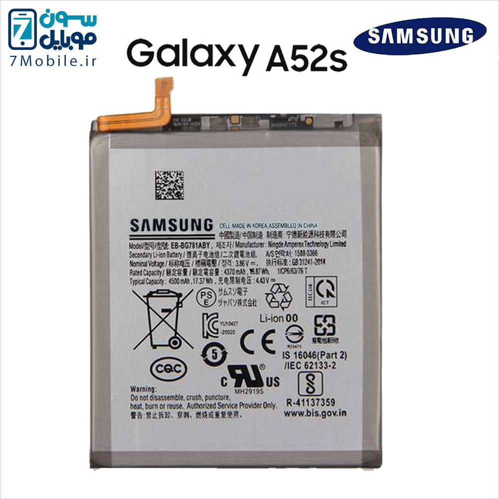 باتری اصلی سامسونگ Samsung Galaxy A52s با کد EB-BG781ABY و EB-BG781BY که ظرفیت 4500 میلی آمپری دارد و از نوع لیتیوم یون داخلی با ولتاژ 3.8 ولت می‌باشد. این مدل از باتری سامسونگ دارای گارانتی تعویض و بادکردگی به مدت 6 ماه است. توجه داشته باشید این مدل باتری سامسونگ جز باتری‌های داخلی و جدانشدنی است که توسط کاربر قابل تعویض نمی‌باشد و برای تعویض آن باید به مراکز معتبر مراجعه کنید.