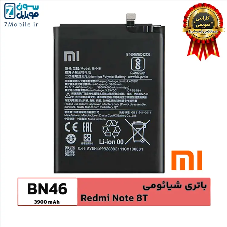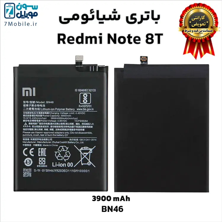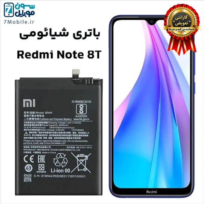 باتری اصلی شیائومی Xiaomi Redmi Note 8T با ۶ ماه گارانتی تعویض بی قید و شرط حتی بادکردگی سون موبایل و کد فنی باتری BN46 که ظرفیت ۳۹۰۰ میلی آمپری با ولتاژ ۳.۸ ولت دارد.