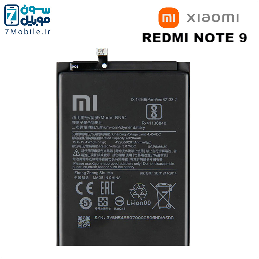 باتری اصلی شیائومی Xiaomi Redmi Note 9 با 6 ماه گارانتی که مدل آن BN54 است و ظرفیت 4920 میلی آمپری دارد و از نوع لیتیوم پلیمر داخلی با ولتاژ 3.8 ولت می باشد. این مدل باتری شیائومی دارای گارانتی تعویض و بادکردگی به مدت 6 ماه است. توجه داشته باشید این مدل باتری شیائومی جز باتری های داخلی و جدانشدنی است که توسط کاربر قابل تعویض نمی باشد و برای تعویض آن باید به مراکز معتبر مراجعه کنید.