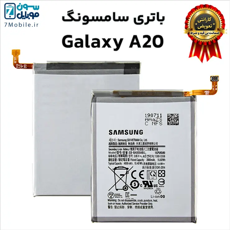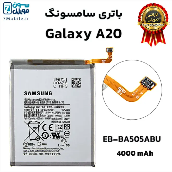باتری اصلی سامسونگ Samsung Galaxy A20 با کد فنی باتری EB-BA505ABU با ۶ ماه گارانتی تعویض بی قید و شرط حتی بادکردگی سون موبایل که ظرفیت ۴۰۰۰ میلی آمپری با ولتاژ ۳.۸ ولت دارد. توجه داشته باشید این مدل باتری Samsung Galaxy A20 جز باتری های داخلی و جدانشدنی (Non-Removable) است که توسط کاربر قابل تعویض نمی‌باشد و برای تعویض آن باید به مراکز معتبر تعمیرات تلفن‌های همراه مراجعه کنید.