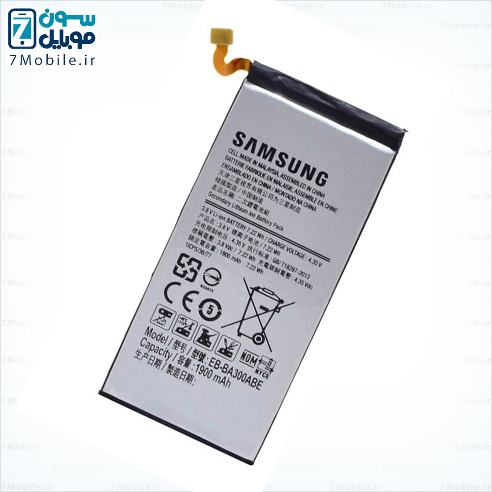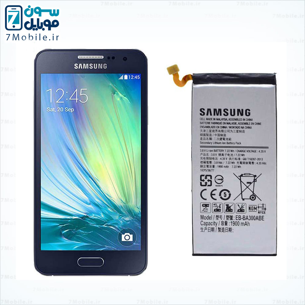 باتری اصلی گوشی Samsung Galaxy A3 2015- A300 که مدل آن EB-BA300ABE می باشد. این باطری با ظرفیت 1900 میلی آمپری از نوع Li-ion با ولتاژ 3.8 ولت می باشد که دارای گارانتی تعویض نیز است.