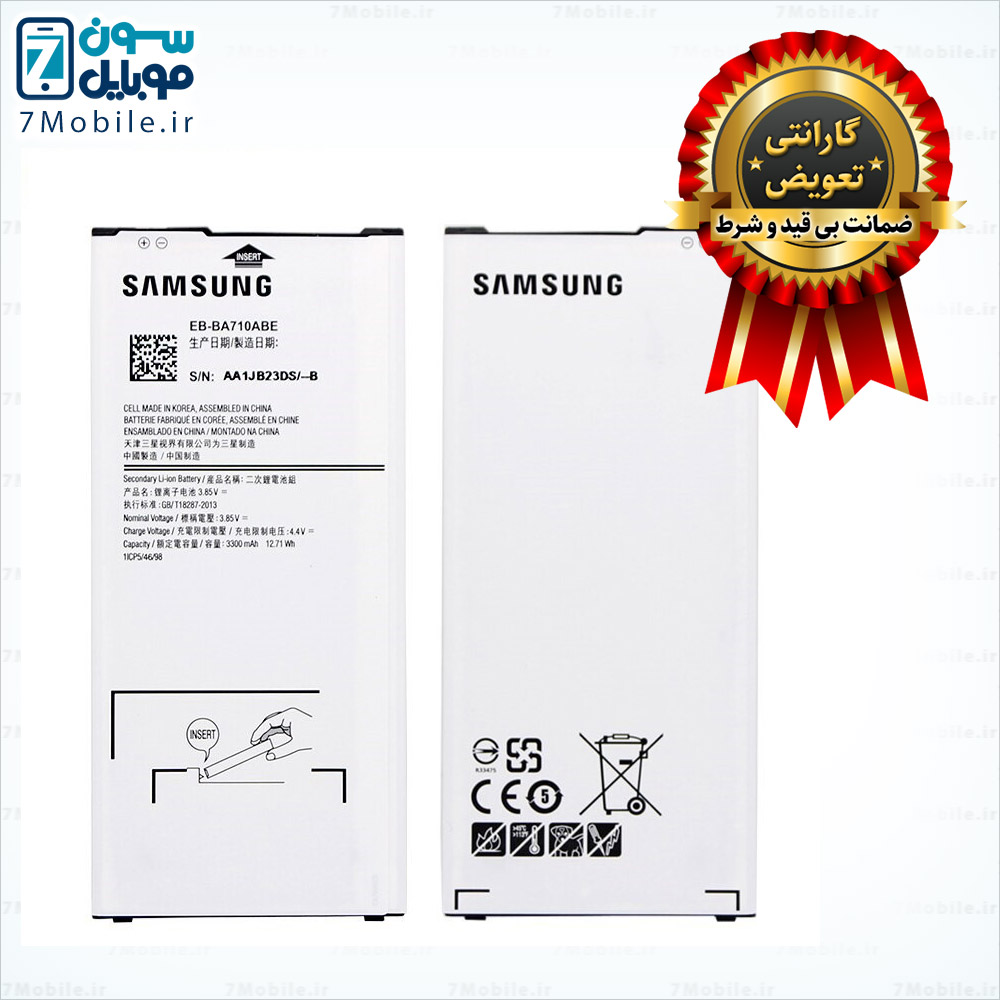 باطری اصلی گوشی Samsung Galaxy A7 2016 – A710 که مدل آن EB-BG610BBE _ EB-BG610ABE _ EB-BA710ABE می باشد. این باطری با ظرفیت 3300 میلی آمپری از نوع Li-ion با ولتاژ 3.8 ولت می باشد که دارای گارانتی تعویض نیز است.