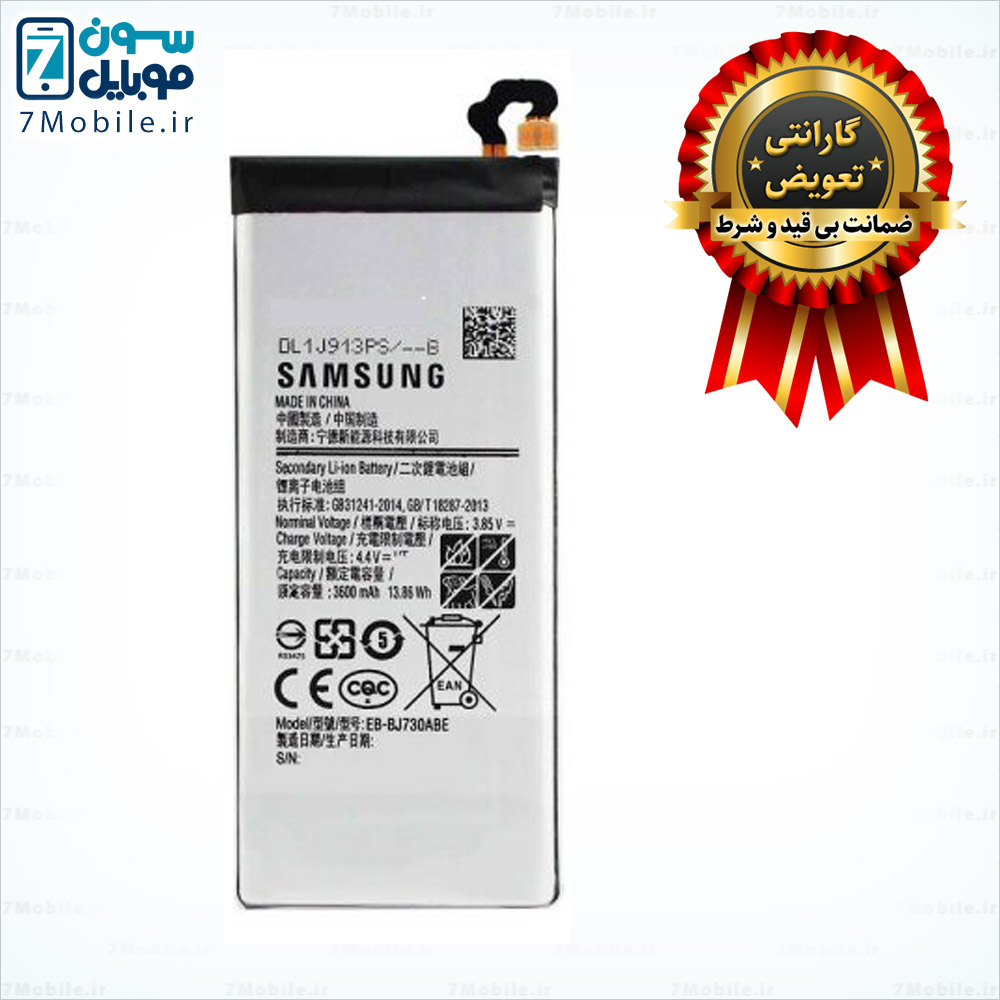 باتری اصلی سامسونگ Samsung Galaxy A7 2017 با 6 ماه گارانتی EB-BJ730ABE و EB-BA720ABE است و ظرفیت 3600 میلی آمپری دارد و از نوع لیتیوم یونی با ولتاژ 3.8 ولت می باشد. این مدل از باتری سامسونگ دارای گارانتی تعویض و بادکردگی به مدت 6 ماه است. توجه داشته باشید این مدل باتری جز باتری های داخلی و جدانشدنی است و برای تعویض آن باید به مراکز معتبر مراجعه کنید.