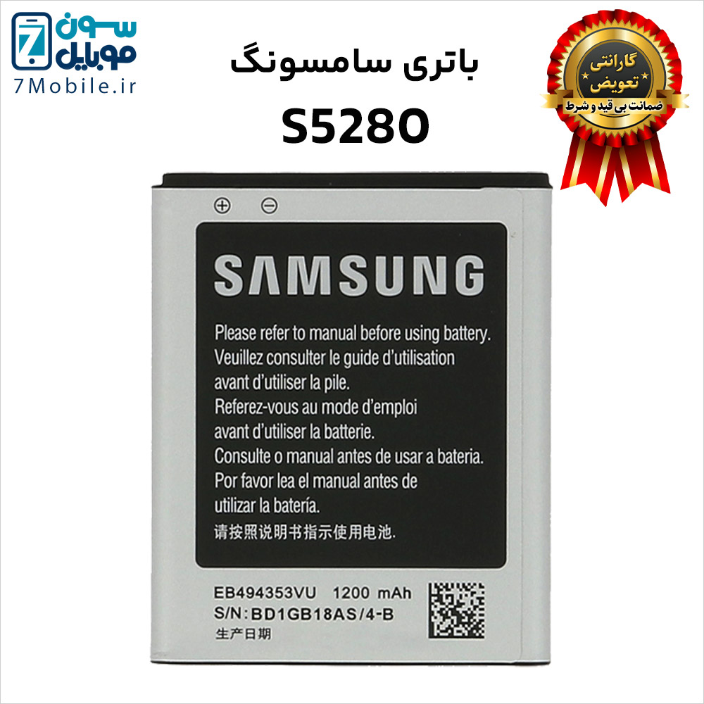 باطری اصلی گوشی Samsung Galaxy Star S5280 با 6 ماه گارانتی که مدل آن EB494353VU می باشد. این باطری با ظرفیت 1200 میلی آمپری از نوع Li-ion با ولتاژ 3.7 ولت می باشد که دارای گارانتی تعویض نیز است.
