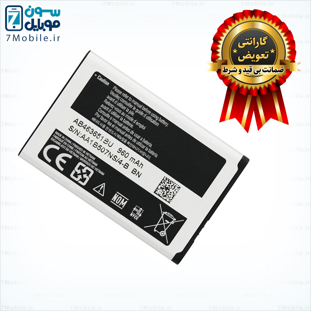 باطری اصلی گوشی Samsung S5610 که مدل آن AB463651BU می باشد. این باطری با ظرفیت 960 میلی آمپری از نوع Li-ion با ولتاژ 3.7 ولت می باشد که دارای گارانتی تعویض نیز است.