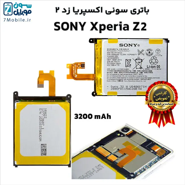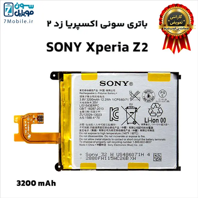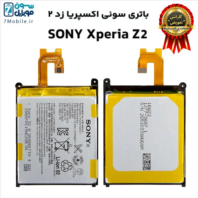 باتری اصلی سونی اکسپریا SONY Xperia Z2 با کد فنی باتری LIS1543ERPC با ۶ ماه گارانتی تعویض بی قید و شرط حتی بادکردگی سون موبایل که ظرفیت ۳۲۰۰ میلی آمپری با ولتاژ ۳.۷ ولت دارد. توجه داشته باشید این مدل باتری سونی SONY Xperia Z2 جز باتری های داخلی و جدانشدنی (Non-Removable) است که توسط کاربر قابل تعویض نمی‌باشد و برای تعویض آن باید به مراکز معتبر تعمیرات تلفن‌های همراه مراجعه کنید.