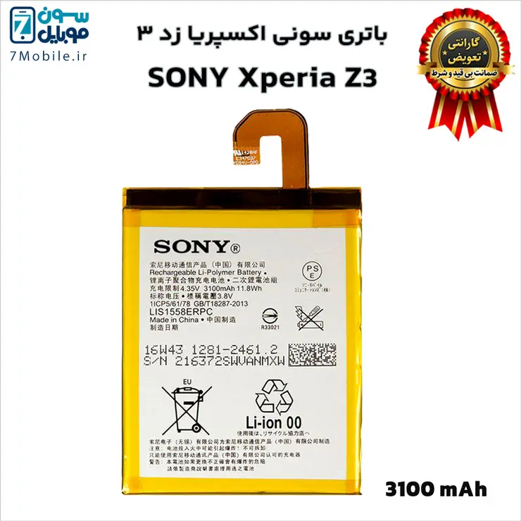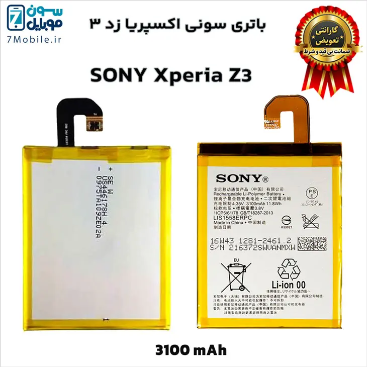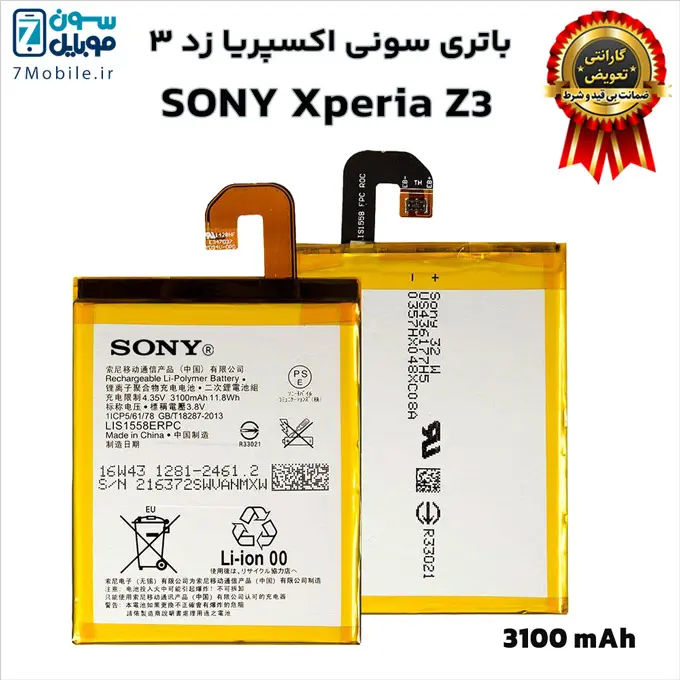 باتری اصلی سونی اکسپریا SONY Xperia Z3 با کد فنی باتری LIS1558ERPC با ۶ ماه گارانتی تعویض بی قید و شرط حتی بادکردگی سون موبایل که ظرفیت ۳۱۰۰ میلی آمپری با ولتاژ ۳.۸ ولت دارد. توجه داشته باشید این مدل باتری سونی SONY Xperia Z3 جز باتری های داخلی و جدانشدنی (Non-Removable) است که توسط کاربر قابل تعویض نمی‌باشد و برای تعویض آن باید به مراکز معتبر تعمیرات تلفن‌های همراه مراجعه کنید.