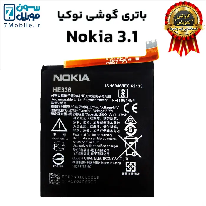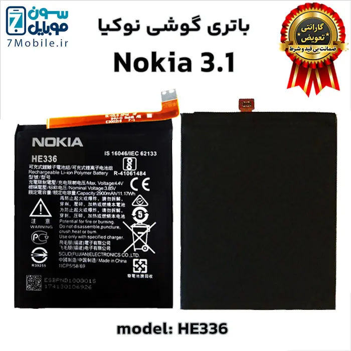 باتری اصلی نوکیا Nokia 3.1 با 6 ماه گارانتی تعویض بی قید و شرط حتی بادکردگی سون موبایل با کد باتری HE351 و HE336 که ظرفیت ۲۹۰۰ میلی آمپری دارد و از نوع لیتیوم پلیمر داخلی با ولتاژ ۳.۸ ولت می‌باشد.