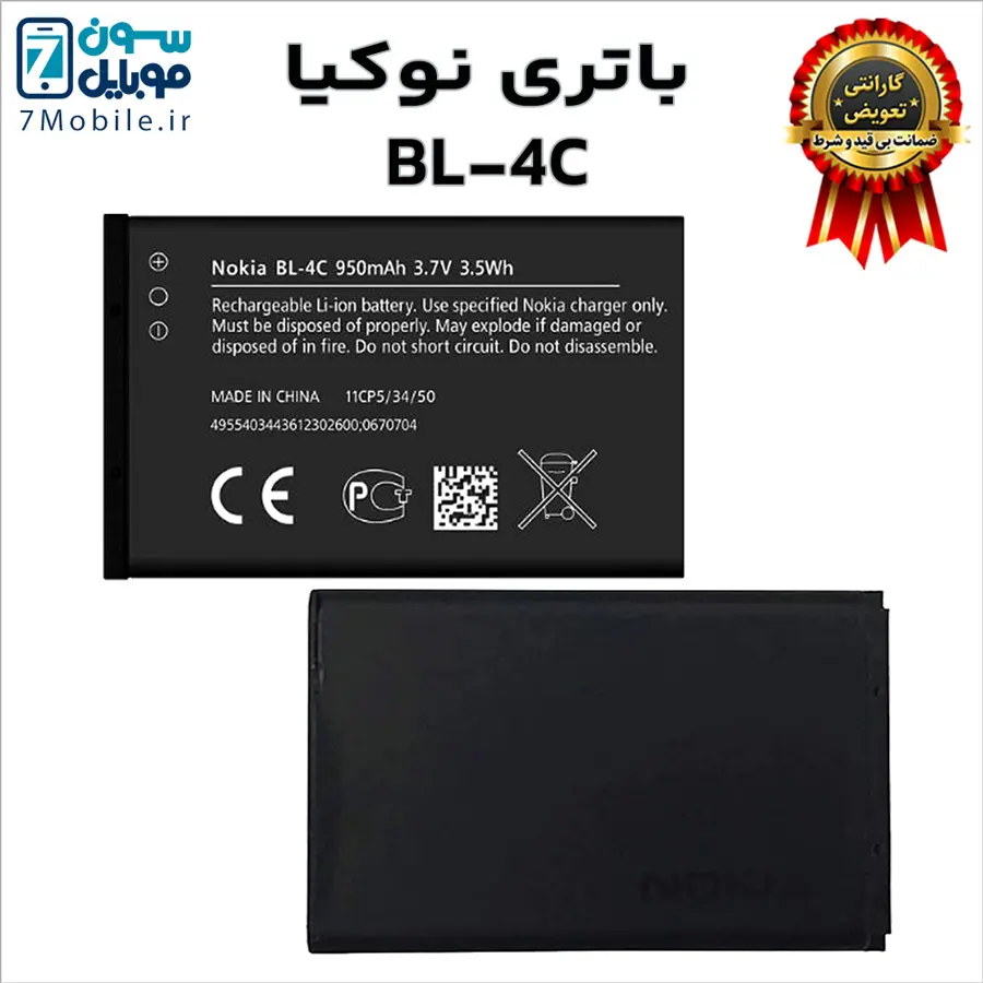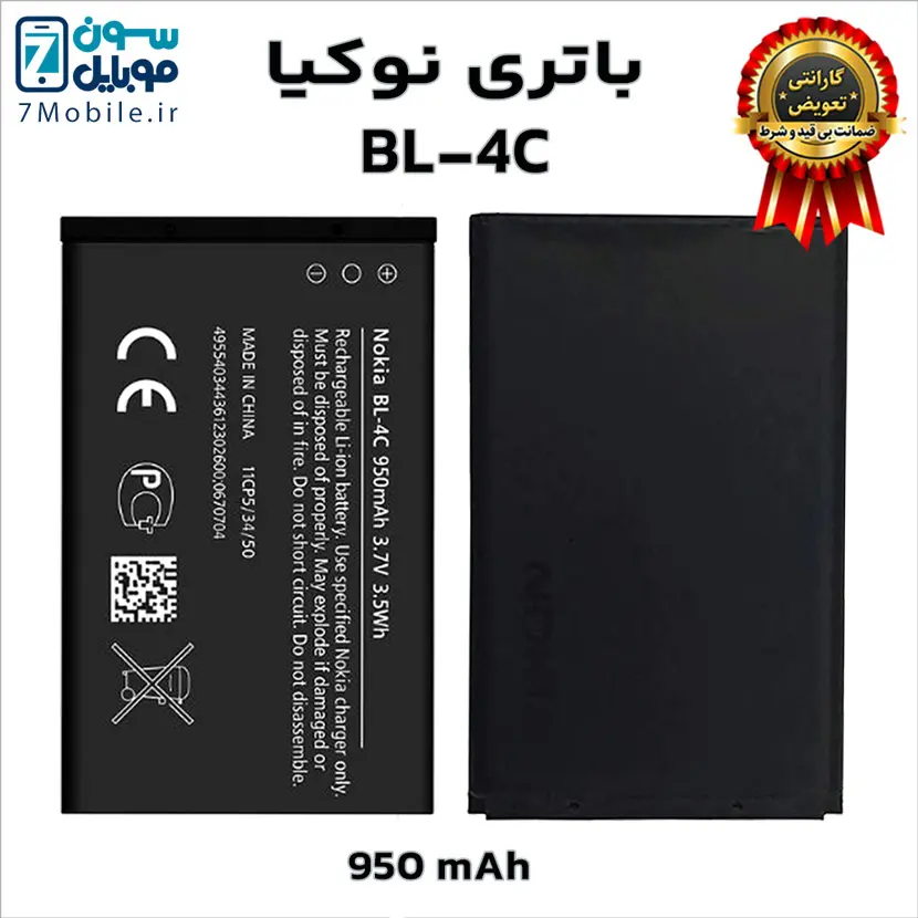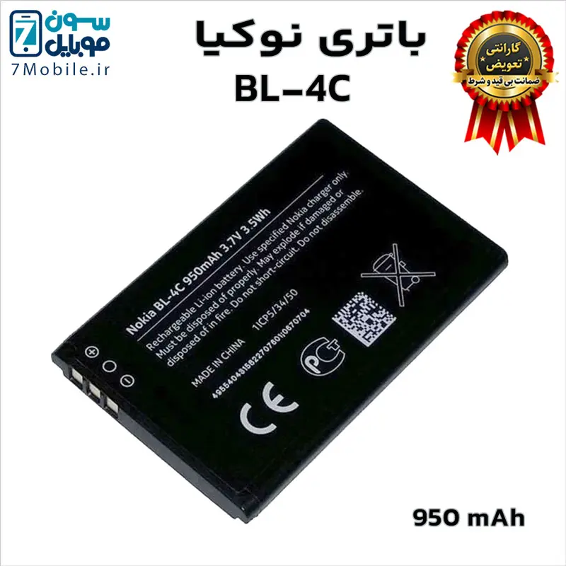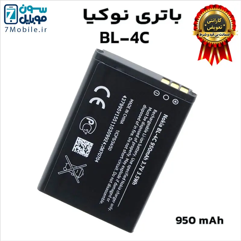 باتری اصلی نوکیا Nokia BL-4C با ۶ ماه گارانتی تعویض بی قید و شرط حتی بادکردگی سون موبایل که ظرفیت ۹۵۰ میلی‌آمپری با ولتاژ ۳.۷ ولت دارد. این باتری نوکیا با گوشی‌های نوکیا مدل: 1265/ 1325/ 2650 / 2652 / 3108/ 5100/ 6066/ 6088/ 6100/ 6101/ 6102/ 6103/ 6125/ 6131/ 6136/ 6170/ 6260/ 6300/ 7200/ 7250/ 7270 سازگار است.