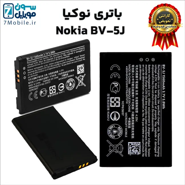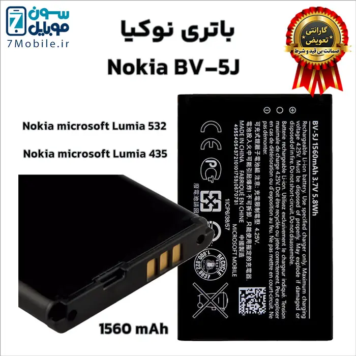 باتری اصلی نوکیا Nokia BV-5J با 6 ماه گارانتی تعویض بی قید و شرط حتی بادکردگی که ظرفیت 1560 میلی‌آمپری دارد و از نوع لیتیوم یون با ولتاژ 3.7 ولت می‌باشد. این مدل باتری نوکیا مناسب گوشی نوکیا Microsoft Nokia Lumia 435 و Microsoft Nokia Lumia 523 است.