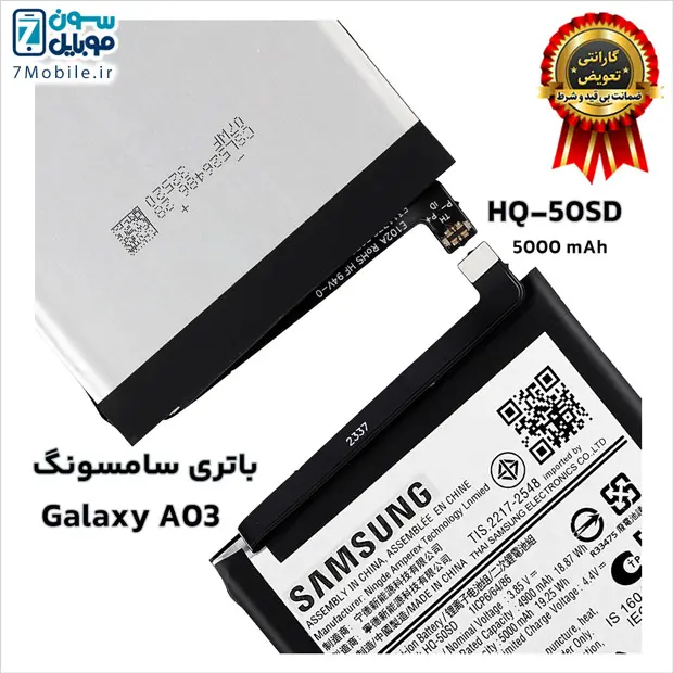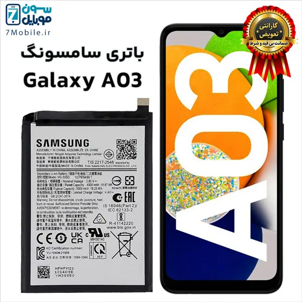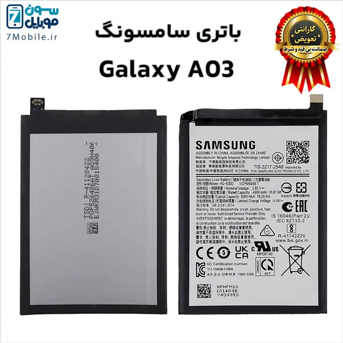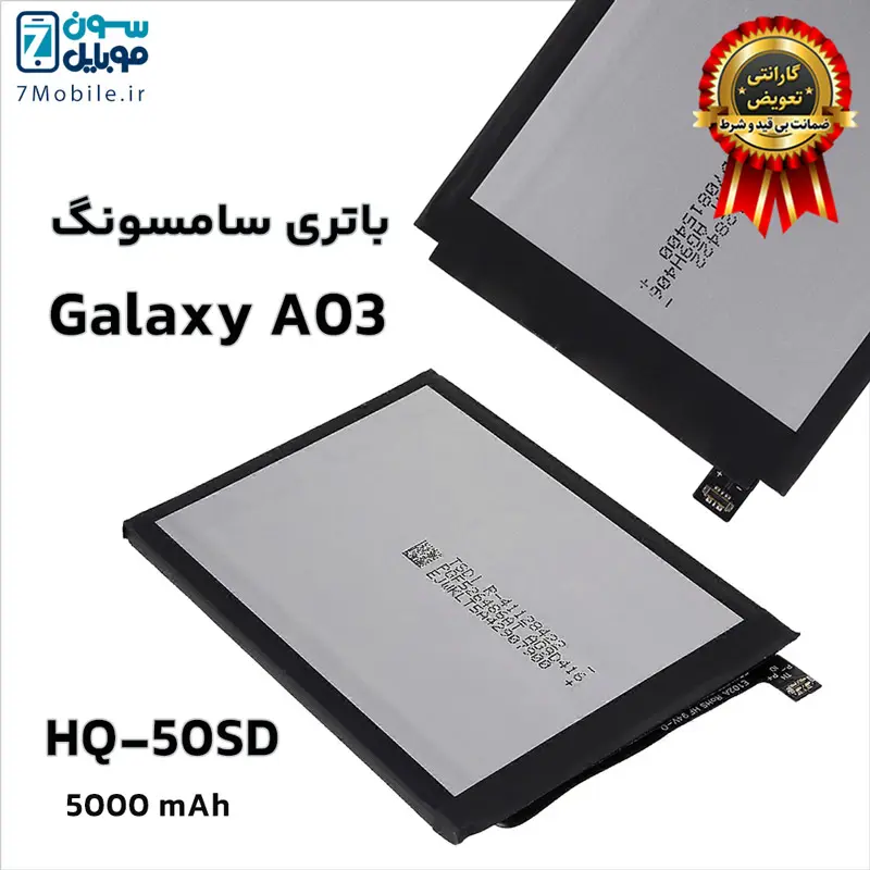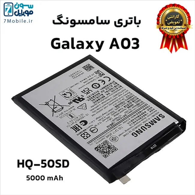 باتری اصلی سامسونگ Samsung Galaxy A03 با کد فنی باتری HQ-50SD با 6 ماه گارانتی تعویض بی قید و شرط حتی بادکردگی سون موبایل که ظرفیت 5000 میلی آمپری با ولتاژ 3.8 ولت دارد. توجه داشته باشید این مدل باتری Samsung Galaxy A03 جز باتری های داخلی و جدانشدنی (Non-Removable) است که توسط کاربر قابل تعویض نمی‌باشد و برای تعویض آن باید به مراکز معتبر تعمیرات تلفن‌های همراه مراجعه کنید.