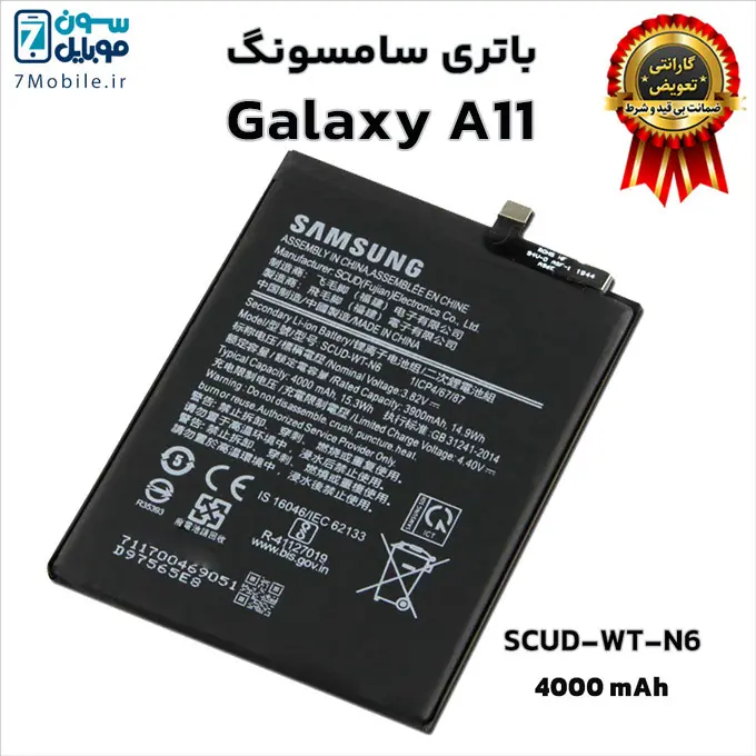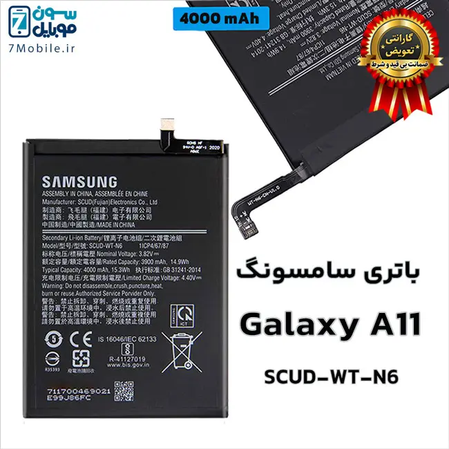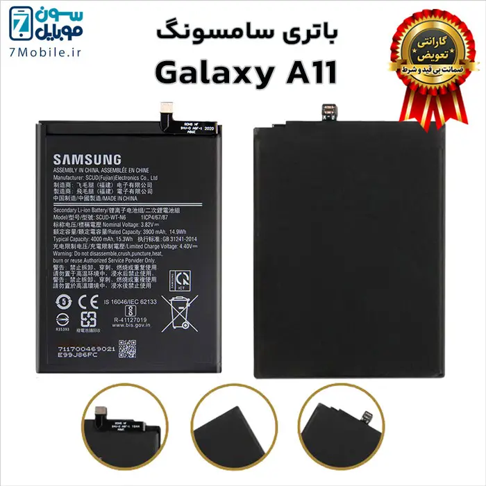 باتری اصلی سامسونگ Samsung Galaxy A11 با کد فنی باتری SCUD-WT-N6 با 6 ماه گارانتی تعویض بی قید و شرط حتی بادکردگی سون موبایل که ظرفیت ۴۰۰۰ میلی آمپری با ولتاژ ۳.۸ ولت دارد. توجه داشته باشید این مدل باتری Samsung Galaxy A11 جز باتری های داخلی و جدانشدنی (Non-Removable) است که توسط کاربر قابل تعویض نمی‌باشد و برای تعویض آن باید به مراکز معتبر تعمیرات تلفن‌های همراه مراجعه کنید.