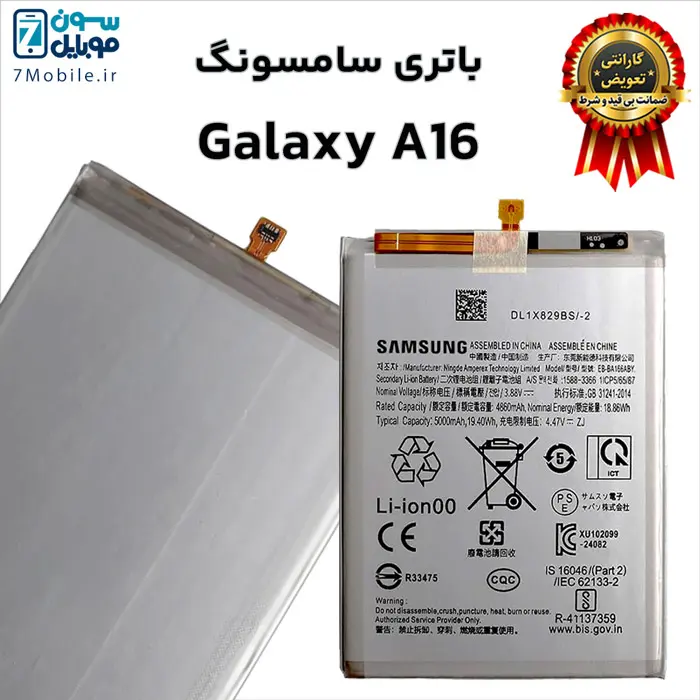 باتری اصلی سامسونگ Samsung Galaxy A16 با کد فنی باتری EB-BA166ABY با 6 ماه گارانتی تعویض بی قید و شرط حتی بادکردگی سون موبایل که ظرفیت 5000 میلی آمپری با ولتاژ 3.8 ولت دارد. توجه داشته باشید این مدل باتری Samsung Galaxy A16 جز باتری های داخلی و جدانشدنی (Non-Removable) است که توسط کاربر قابل تعویض نمی‌باشد و برای تعویض آن باید به مراکز معتبر تعمیرات تلفن‌های همراه مراجعه کنید.