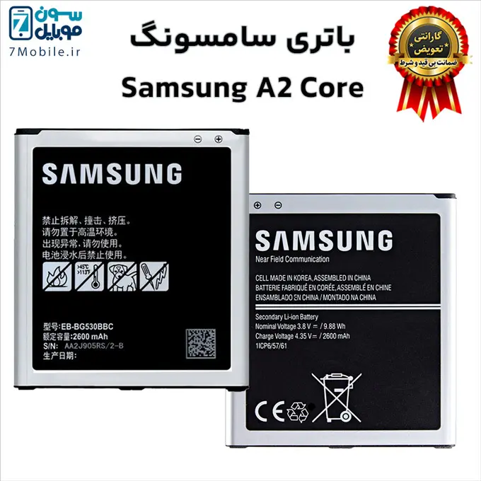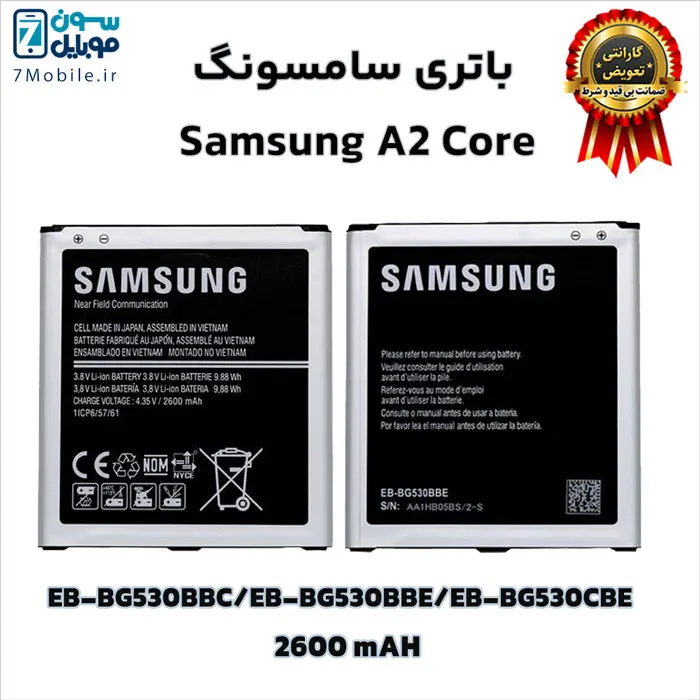 باتری اصلی سامسونگ Samsung Galaxy A2 Core با 6 ماه گارانتی تعویض بی قید و شرط حتی بادکردگی و کد فنی باتری EB-BG530BBC یا EB-BG530BBE و یا EB-BG530CBE که ظرفیت ۲۶۰۰ میلی‌آمپری دارد و از نوع لیتیوم یون با ولتاژ ۳.۸ ولت می‌باشد.