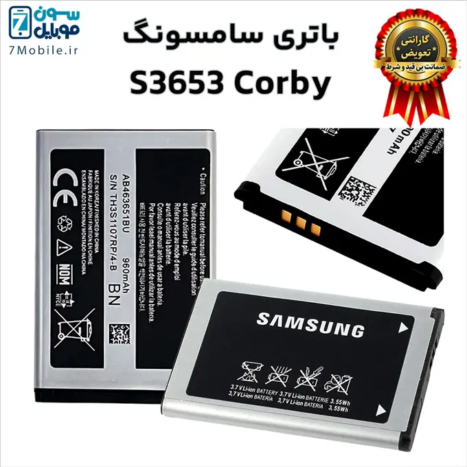 باتری اصلی سامسونگ Samsung S3653 Corby با 6 ماه گارانتی تعویض بی قید و شرط حتی بادکردگی و کد فنی باتری AB463651BN یا AB463651BU که ظرفیت ۹۶۰ میلی‌آمپری دارد و از نوع لیتیوم یون با ولتاژ ۳.۷ ولت می‌باشد.