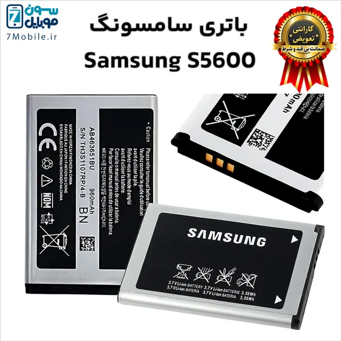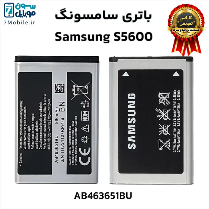 باتری اصلی سامسونگ Samsung S5600 با 6 ماه گارانتی تعویض بی قید و شرط حتی بادکردگی و کد فنی باتری AB463651BN یا AB463651BU که ظرفیت ۹۶۰ میلی‌آمپری دارد و از نوع لیتیوم یون با ولتاژ ۳.۷ ولت می‌باشد.