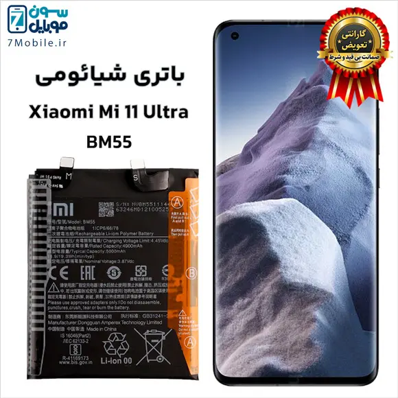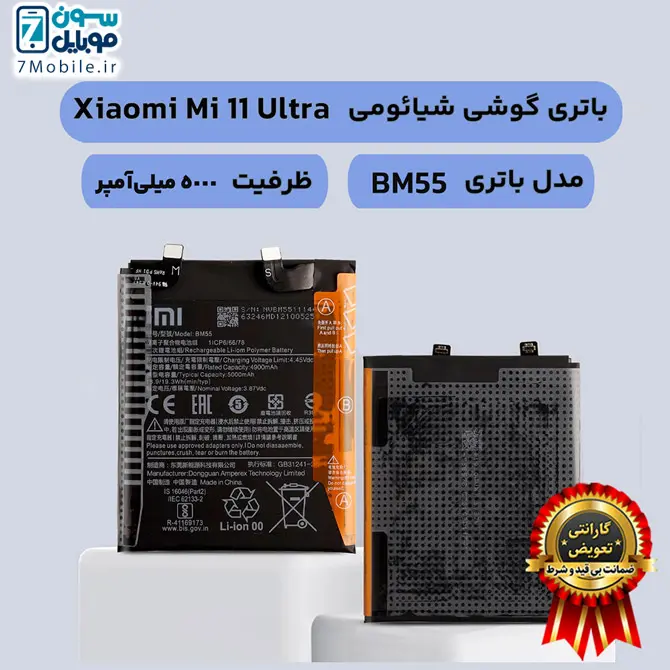 باتری اصلی شیائومی Xiaomi Mi 11 Ultra با 6 ماه گارانتی با کد فنی باتری BM55 با ۶ ماه گارانتی تعویض بی قید و شرط حتی بادکردگی سون موبایل که ظرفیت ۵۰۰۰ میلی آمپری با ولتاژ ۳.۸ ولت دارد. توجه داشته باشید این مدل باتری Xiaomi Mi 11 Ultra جز باتری های داخلی و جدانشدنی (Non-Removable) است که توسط کاربر قابل تعویض نمی‌باشد و برای تعویض آن باید به مراکز معتبر تعمیرات تلفن‌های همراه مراجعه کنید.
