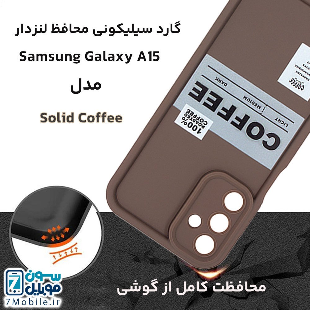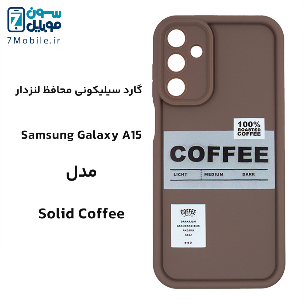 گارد سیلیکونی محافظ لنز‌دار سامسونگ Samsung Galaxy A15 مدل Solid Coffee، با طراحی زیبا و خاص، از جنس سیلیکون درجه یک نرم و لطیف با قابلیت ویژه طراحی برآمدگی بالاتر از لبه‌های دوربین و صفحه نمایش گوشی که این برجستگی عالی، از لنز و ال سی دی گوشی سامسونگ A15 شما به بهترین نحو ممکن محافظت می‌کند.
